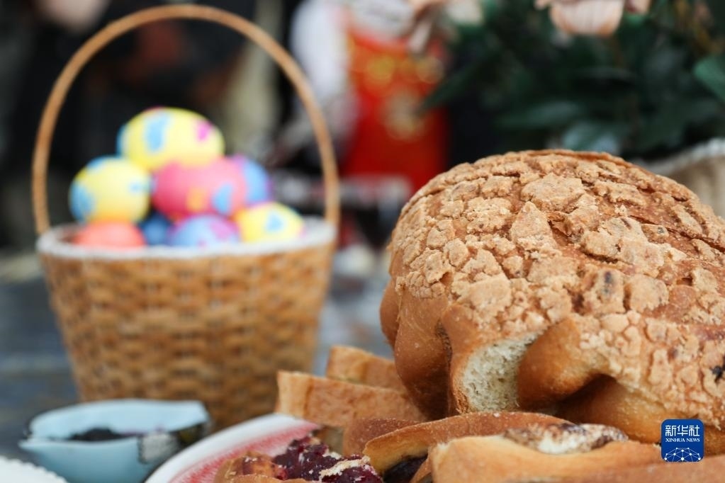 4月16日拍攝的當(dāng)?shù)厝罕姙橛影退箍斯?jié)準(zhǔn)備的美食和彩蛋。