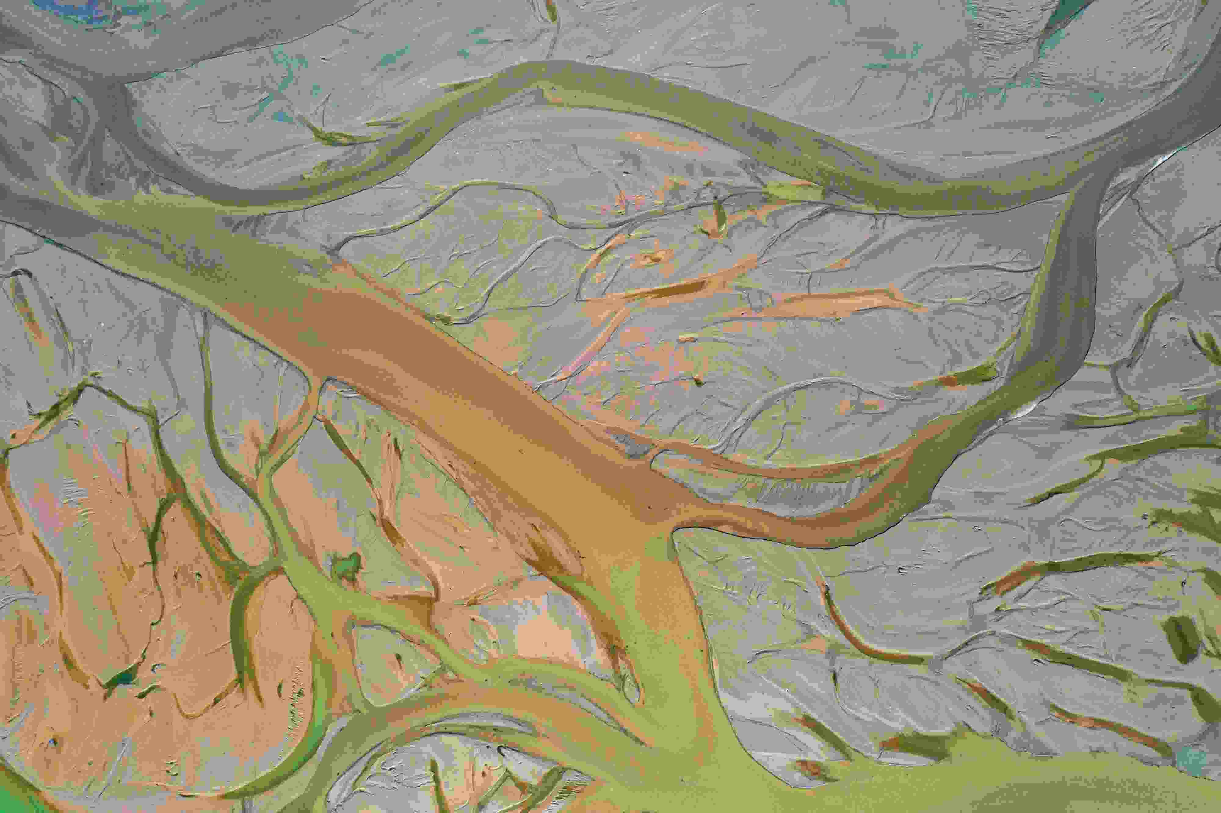 4月16日,山西運(yùn)城,由于黃河上游降雨和庫(kù)區(qū)泄水水量增加,黃河永濟(jì)段河床在水流沖刷下河汊縱橫,高空俯瞰宛若“大地血脈”。 視覺(jué)中國(guó)