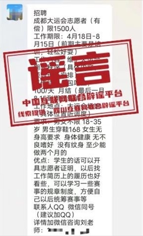 謠言:成都大運(yùn)會志愿者招募中,將按月發(fā)放補(bǔ)貼?