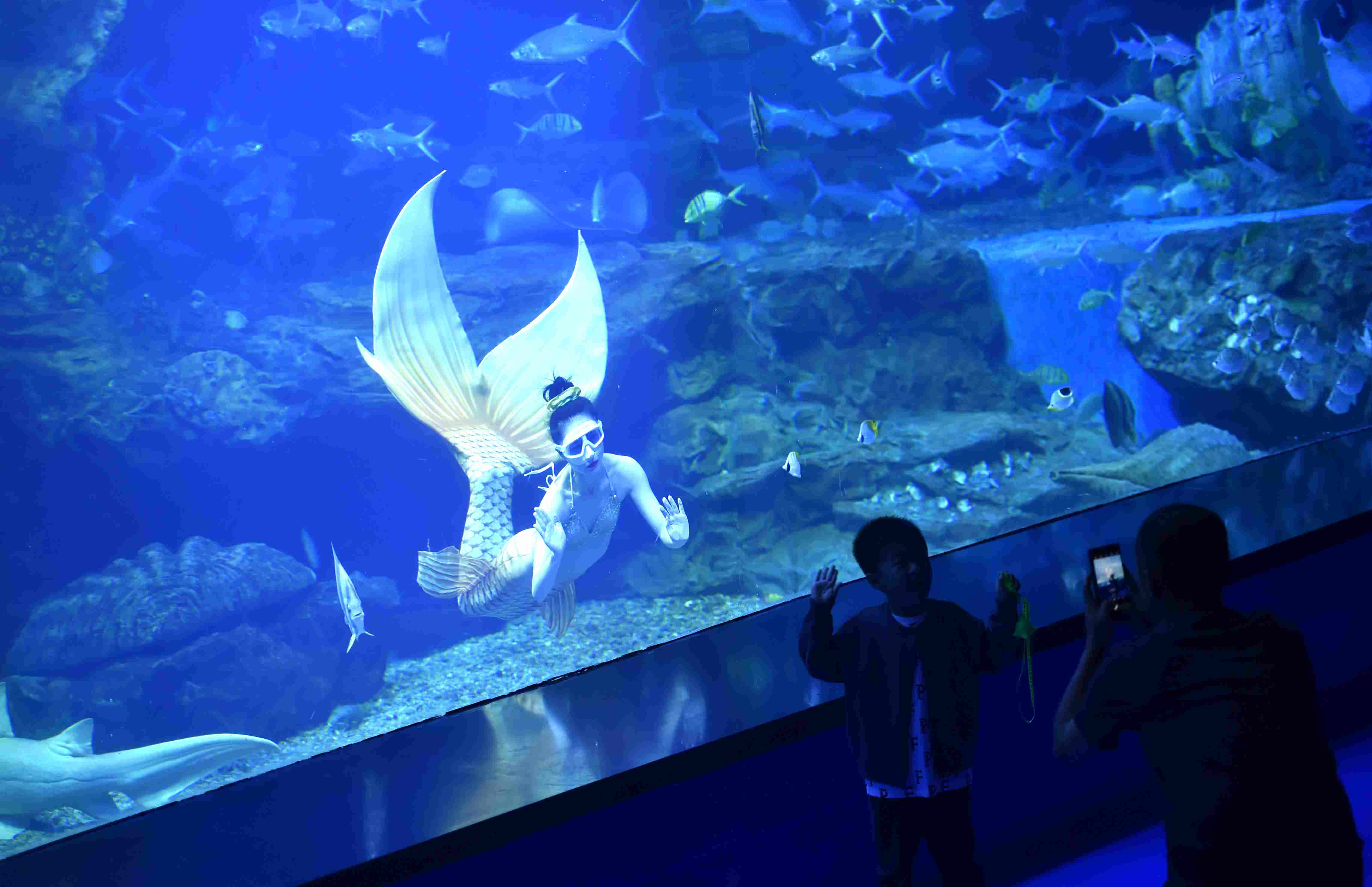 2023年4月28日,“美人魚(yú)”在貴陽(yáng)市多彩貴州城極地海洋世界表演。