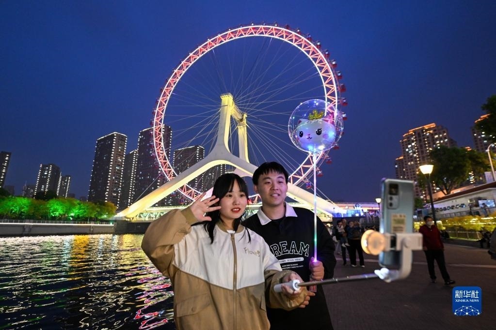 4月27日,游客在海河親水平臺(tái)與“天津之眼”摩天輪留影。