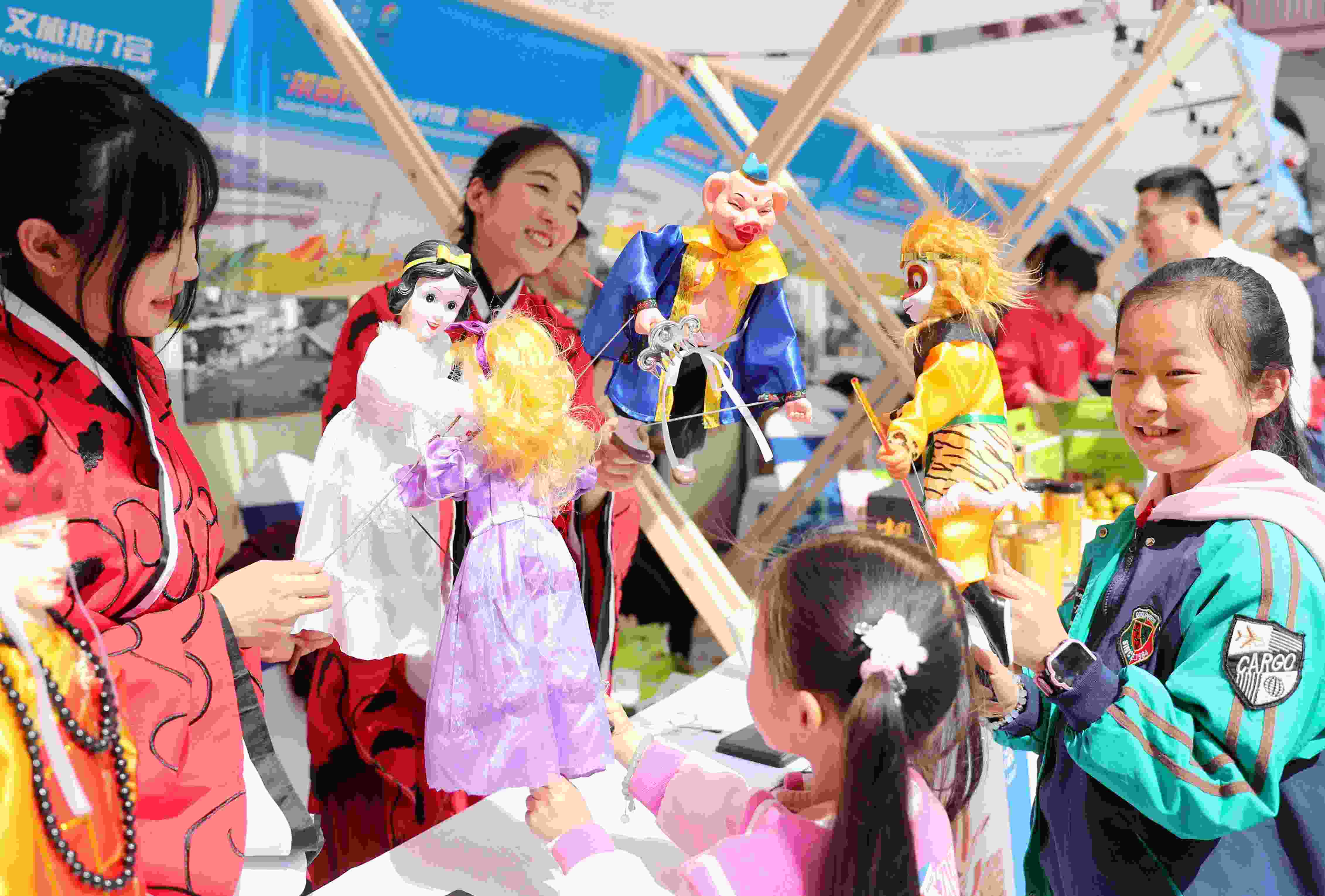 4月30日,山東萊西木偶藝術(shù)團(tuán)的演員在給小朋友們展示木偶戲的表演技巧。 張進(jìn)剛 攝