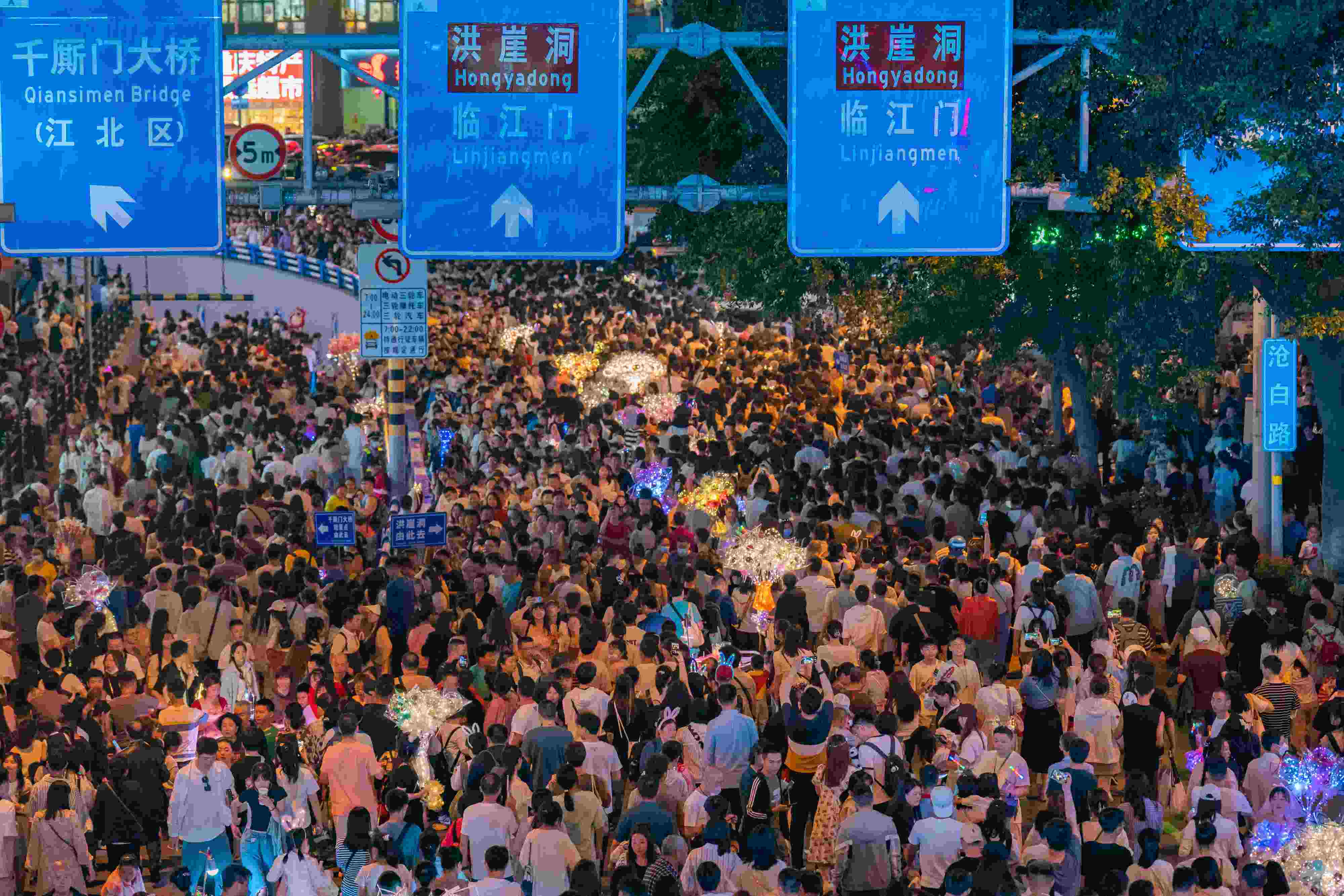 2023年4月30日,重慶,洪崖洞等熱門景點(diǎn)迎來游客高峰,千廝門大橋等多條主干道開啟實(shí)行交通管制,方便游客出行。 視覺中國