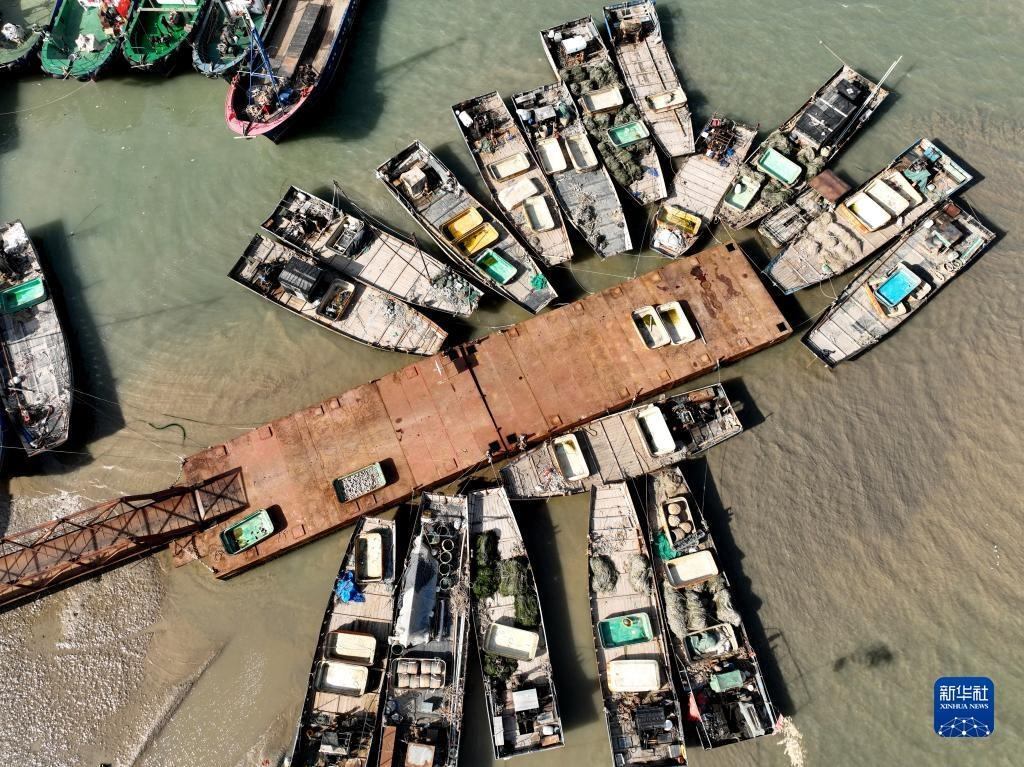 4月30日,在江蘇省連云港市贛榆區(qū)青口漁港碼頭,漁民在卸載漁具,為即將到來(lái)的伏季休漁做準(zhǔn)備(無(wú)人機(jī)照片)。