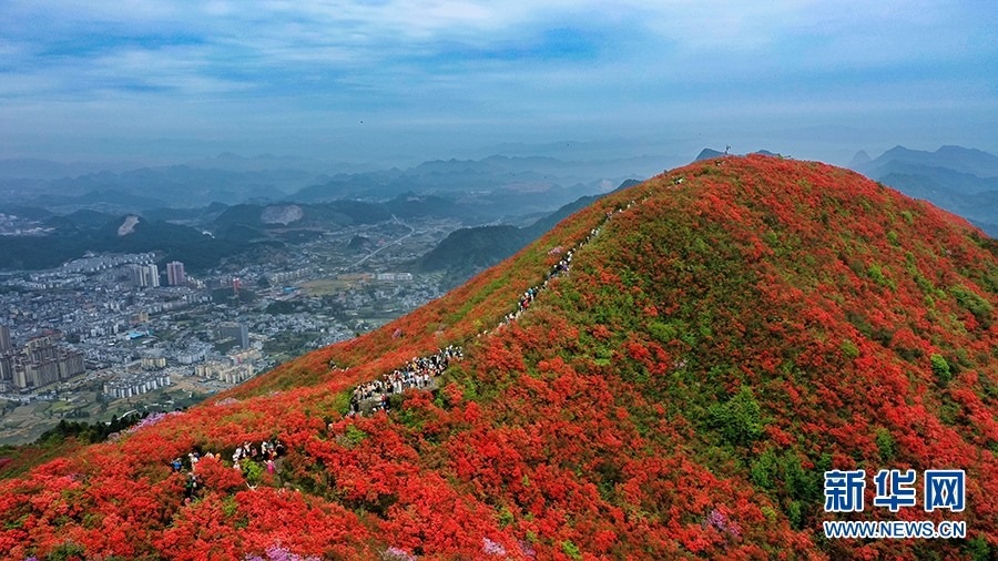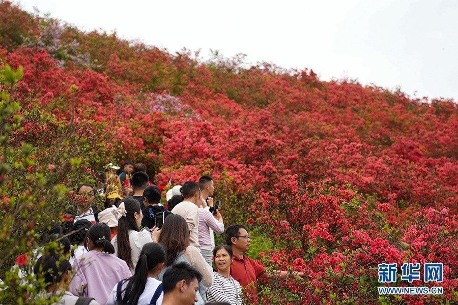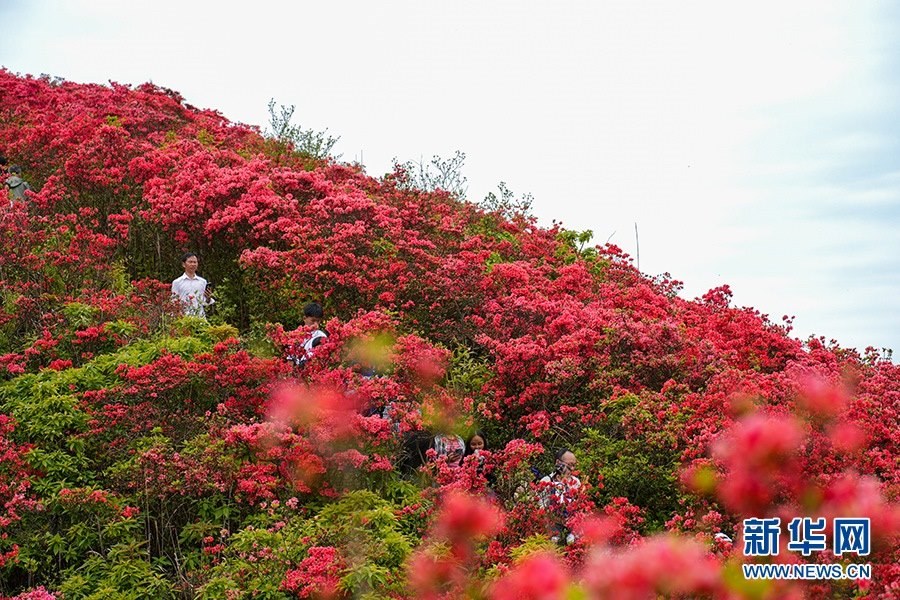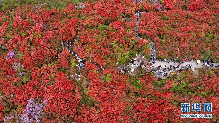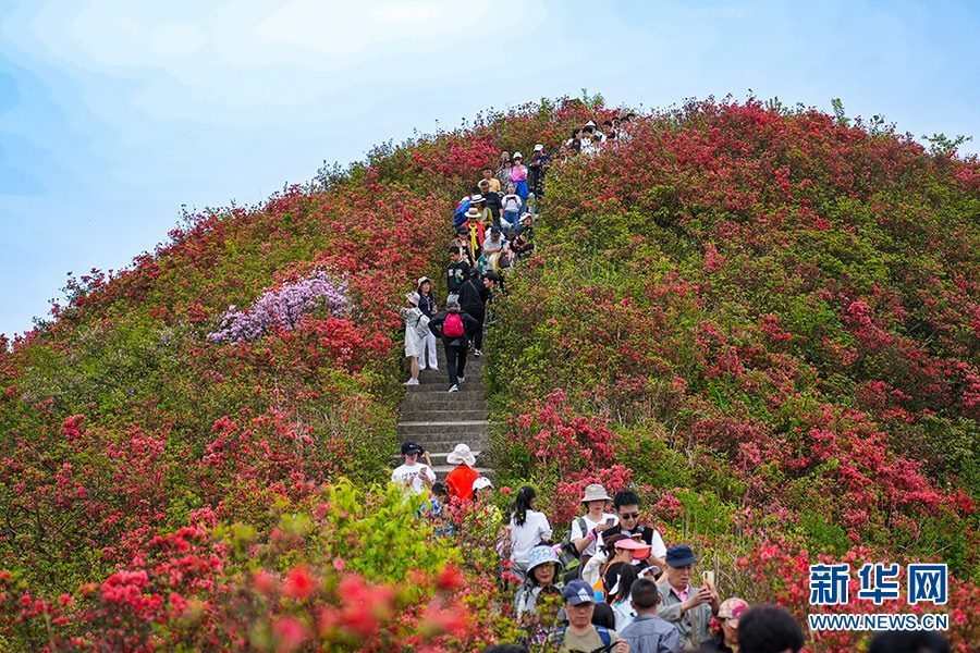 當(dāng)日,在貴州省黔東南苗族侗族自治州丹寨縣縣城邊海拔1400多米的龍泉山,萬畝杜鵑花競相綻放,山谷間、棧道旁、懸崖上,一顆顆、一簇簇、一朵朵杜鵑花迎風(fēng)搖曳,形成浩瀚花海,引來眾多游客登高望遠(yuǎn),飽覽靈山秀水之美。