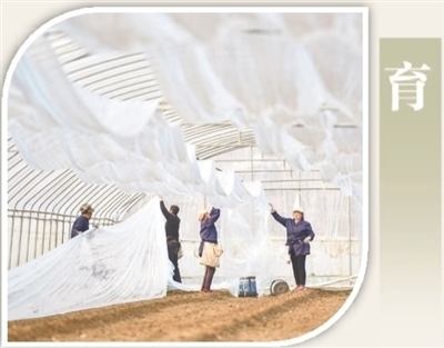 山東省青州市益都街道北河?xùn)|村一處蔬菜育種試驗基地內(nèi),工人在準備蔬菜繁殖所需的保溫膜。王繼林攝(影像中國)