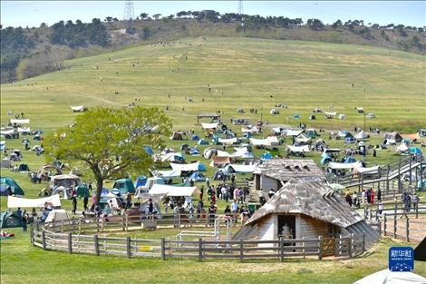 5月1日,游客在遼寧省大連市三寰牧場(chǎng)景區(qū)搭帳篷露營(yíng)。