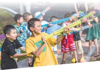 湖南省瀏陽(yáng)市金水河露營(yíng)基地組織小朋友們打撈河中漂浮物。張淼龍攝(人民視覺(jué))