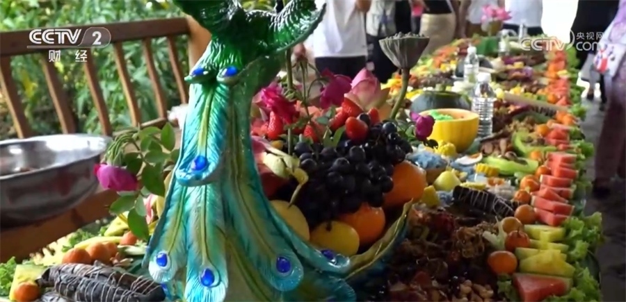 這樣一桌豐盛的美食,需要數(shù)十人齊心協(xié)力才能制作完成。食客們可以根據(jù)自己的喜好、口味隨意搭配,盡情品嘗傣族特色美味。
