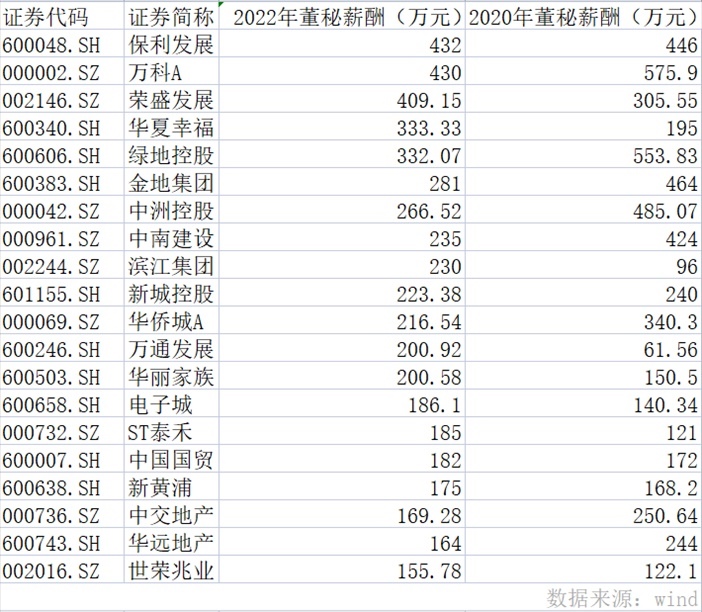 同樣,房企董秘薪酬也下滑,2022年A股上市房企中,薪酬排名前20的董秘平均年薪為250萬元,較2020年的326萬元,下降23.3%。