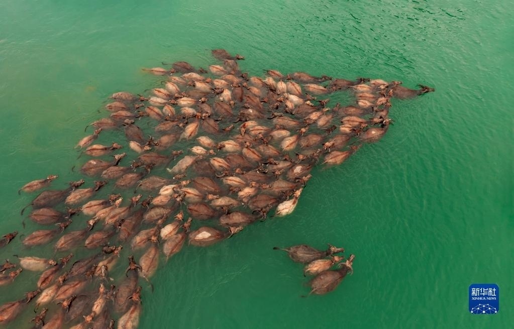 5月13日,在南充市蓬安縣相如鎮(zhèn)油房溝村嘉陵江段,成群結隊的水牛渡江(無人機照片)。