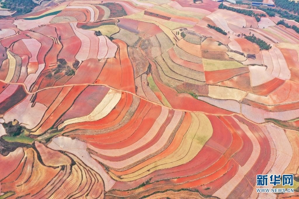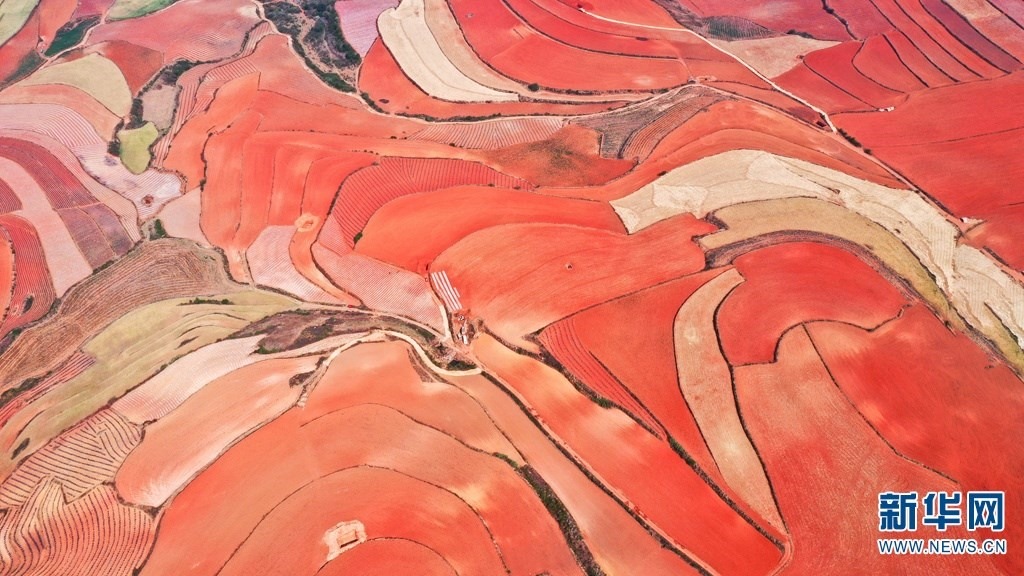 云南省尋甸回族彝族自治縣,連綿不斷的旱梯田遍布山間,遠(yuǎn)接天邊,每年4-5月,經(jīng)過村民翻新、平整后的紅褐色土地,從空中俯瞰五彩斑斕、蔚為壯觀。當(dāng)?shù)卮迕裥燎诟旁诜饰值募t土地上,用勤勞的雙手,繪就一幅幅勞動藝術(shù)畫作。新華網(wǎng)發(fā)(孫文來 攝影報道)