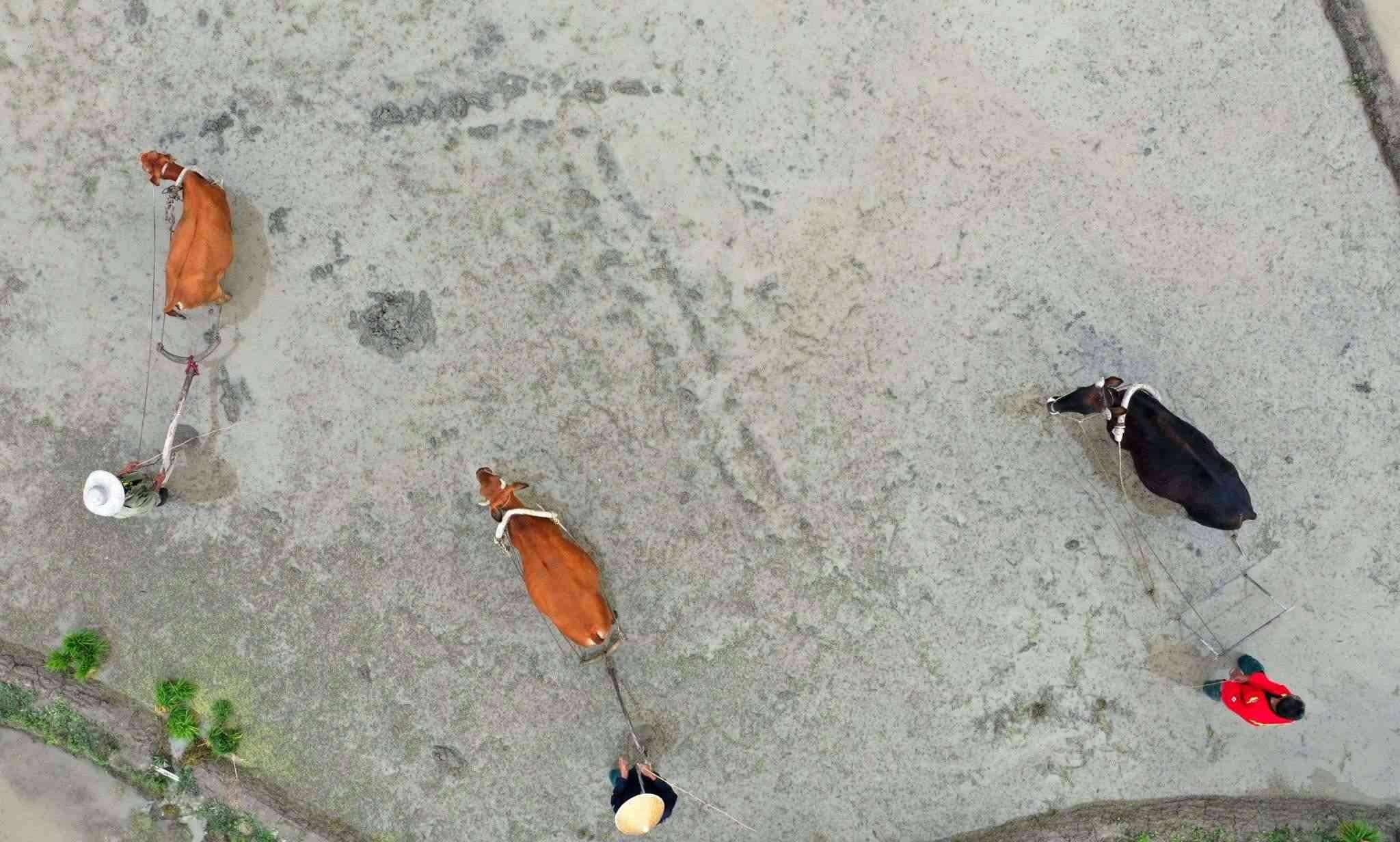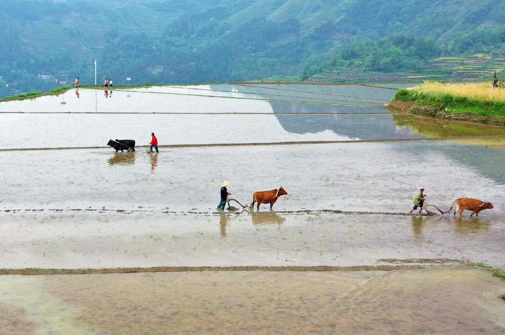 2023年5月19日,重慶,酉陽縣花田鄉(xiāng)何家?guī)r村的梯田里,村民們正在進(jìn)行犁田插秧比賽,向游客展示農(nóng)耕文化魅力。視覺中國