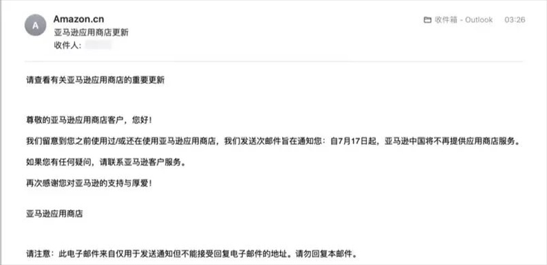 ·亞馬遜應(yīng)用商店發(fā)送郵件提醒稱,自7月17日起亞馬遜中國(guó)將不再提供應(yīng)用商店服務(wù)。