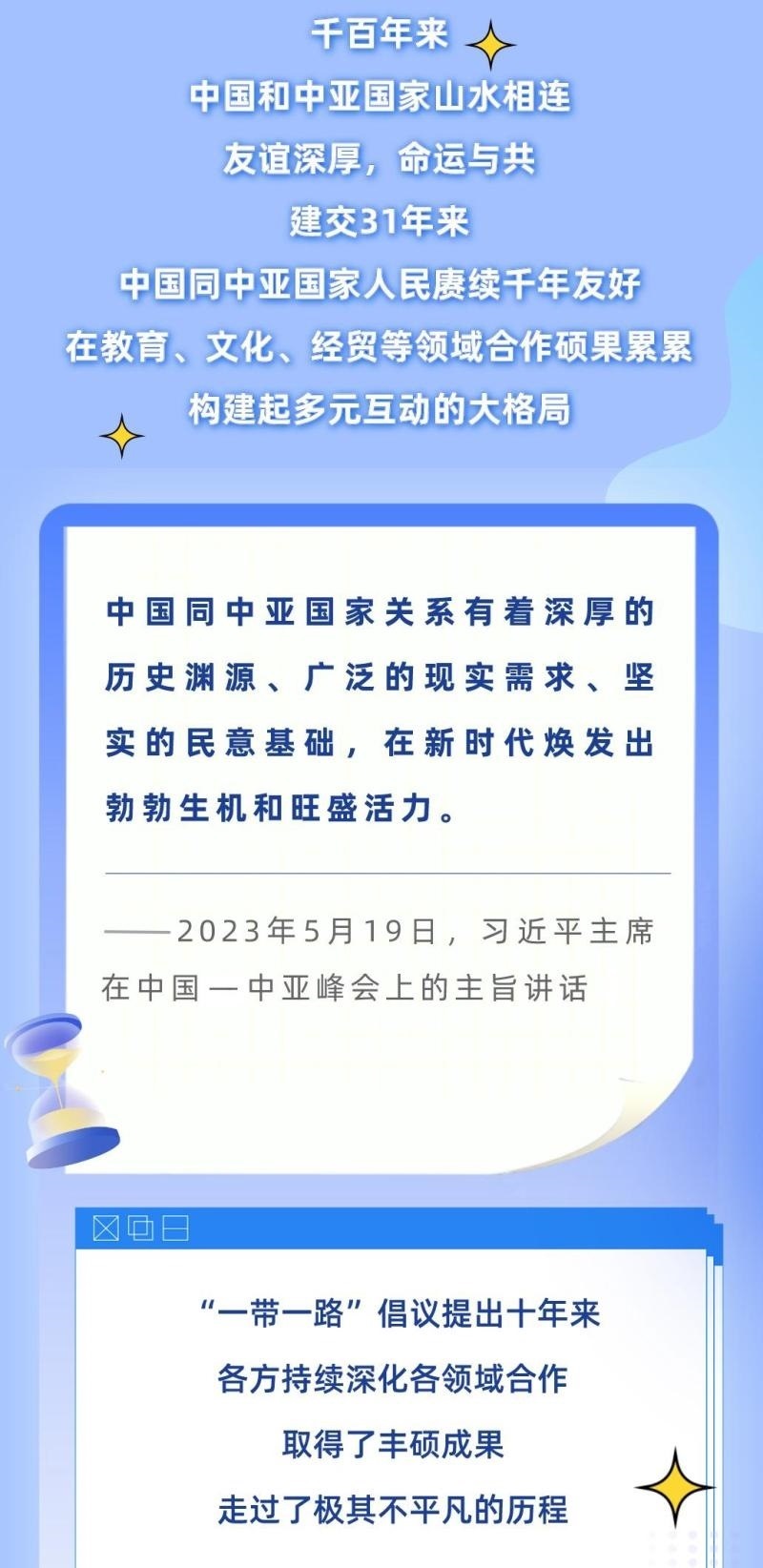 從去年1月的建交30周年視頻峰會,到今年這次中國—中亞峰會,習(xí)近平主席同中亞五國元首連續(xù)兩年集體會晤,并正式成立中國—中亞元首會晤機制,為中國—中亞關(guān)系發(fā)展作出戰(zhàn)略領(lǐng)航。下面,讓我們一起通過習(xí)近平主席的重要講話,回顧中國與中亞國家源遠流長的友誼、極其不凡的合作歷程,讀懂中國—中亞峰會的重要意義。