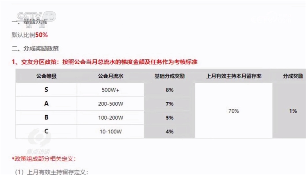 主播得到的打賞,平臺(tái)和經(jīng)紀(jì)機(jī)構(gòu)都會(huì)參與分成。一般來說,平臺(tái)要首先分走50%的打賞費(fèi)用,剩下的由主播和經(jīng)紀(jì)機(jī)構(gòu)來分。從某平臺(tái)與主播經(jīng)紀(jì)公司的后臺(tái)約定中可以看出,當(dāng)月總流水的梯度金額及任務(wù)作為考核。經(jīng)紀(jì)機(jī)構(gòu)月流水超過500萬元,至少可以額外拿到8%的獎(jiǎng)勵(lì)。在這種制度的激勵(lì)下,就推動(dòng)經(jīng)紀(jì)公司和主播想方設(shè)法爭(zhēng)取更高額度的打賞。