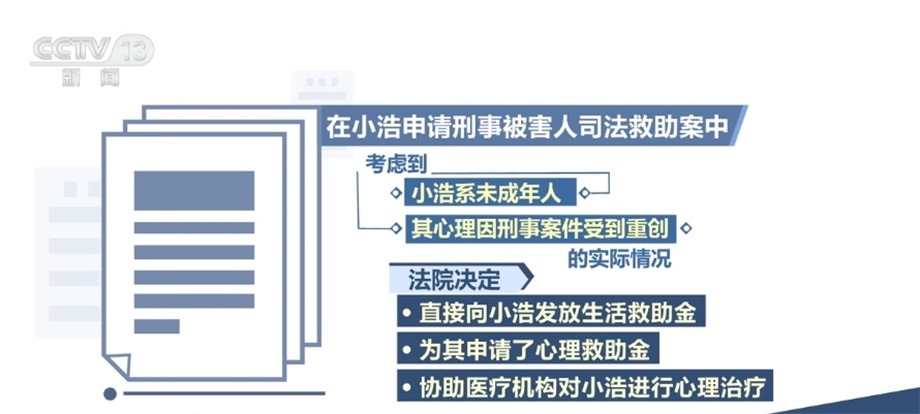在此次發(fā)布的保護(hù)未成年人權(quán)益司法救助典型案例中,還涉及針對(duì)向未成年人提供專門心理救助金、提供心理危機(jī)干預(yù)等立體幫扶,進(jìn)一步延伸司法服務(wù)。在小浩申請(qǐng)刑事被害人司法救助案中,小浩的父親被害,其本人亦受到人身傷害,法院作出刑事附帶民事判決,判處被告人死刑,并判決其賠償附帶民事訴訟原告人經(jīng)濟(jì)損失13萬(wàn)余元。后經(jīng)調(diào)查,被告人無(wú)財(cái)產(chǎn)可供執(zhí)行??紤]到小浩系未成年人,其心理因刑事案件受到重創(chuàng)的實(shí)際情況,法院除決定直接向小浩發(fā)放生活救助金外,還為其申請(qǐng)了心理救助金,協(xié)助醫(yī)療機(jī)構(gòu)對(duì)小浩進(jìn)行心理治療。