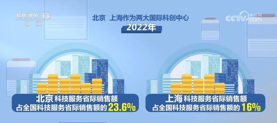 從創(chuàng)新來看,2017年—2022年,全國科技服務(wù)省際銷售額年均增長(zhǎng)28%,較科技服務(wù)總體銷售收入增速快4.2個(gè)百分點(diǎn)。今年截至5月20日,科技服務(wù)省際銷售額同比增長(zhǎng)29.7%,較科技服務(wù)總體銷售收入增速快2.6個(gè)百分點(diǎn)。北京、上海作為兩大國際科創(chuàng)中心,2022年科技服務(wù)省際銷售額分別占全國科技服務(wù)省際銷售額的23.6%和16%;2017年—2022年年均分別增長(zhǎng)22.1%和24.2%。