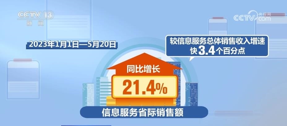 從信息方面來看,2017年—2022年,全國信息服務(wù)省際銷售額年均增長(zhǎng)22%,較信息服務(wù)總體銷售收入增速快2.8個(gè)百分點(diǎn)。2023年1月1日—5月20日,信息服務(wù)省際銷售額同比增長(zhǎng)21.4%,較信息服務(wù)總體銷售收入增速快3.4個(gè)百分點(diǎn)。