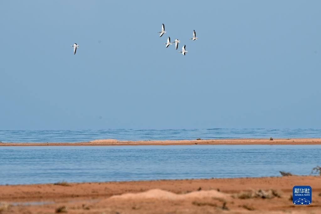 一群斑頭雁在阿爾金山國家級自然保護(hù)區(qū)飛翔(5月23日攝)。