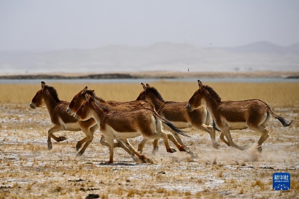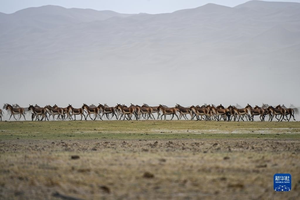 一群藏野驢在阿爾金山國家級自然保護(hù)區(qū)奔跑(5月23日攝)。