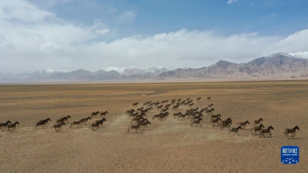 一群藏野驢在阿爾金山國家級自然保護(hù)區(qū)奔跑(5月23日攝,無人機(jī)照片)。