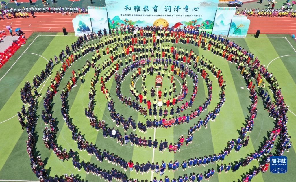 5月30日,在廣西桂林市龍勝各族自治縣龍勝鎮(zhèn)第二小學(xué),師生在跳團圓舞(無人機照片)。 新華社發(fā)(潘志祥攝)