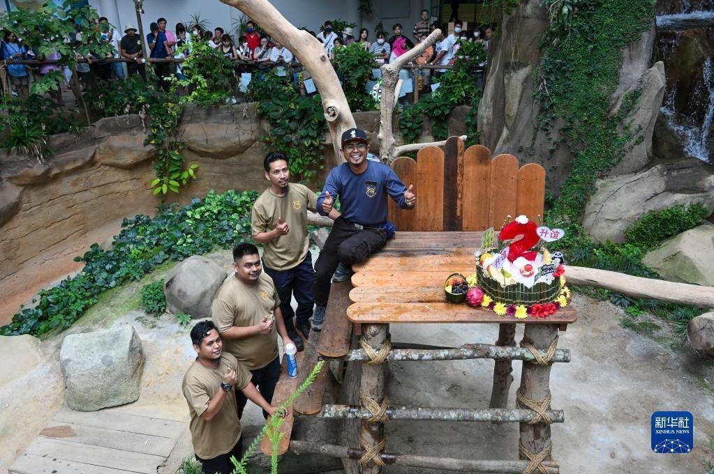 5月31日,在馬來西亞吉隆坡附近的馬來西亞國(guó)家動(dòng)物園,大熊貓飼養(yǎng)員阿克邁勒(右)和他的團(tuán)隊(duì)與“升誼”的生日蛋糕合影。
