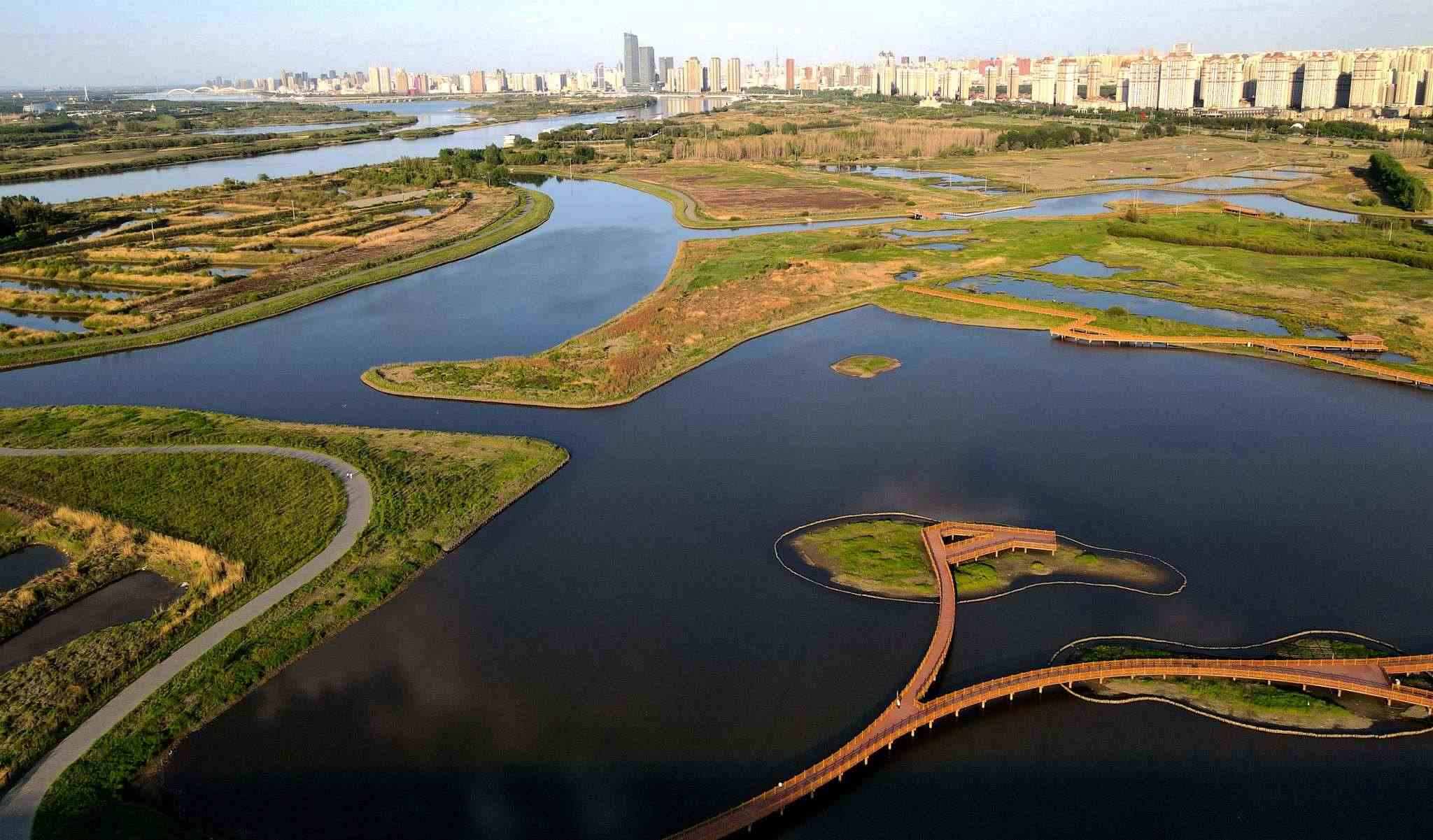 2023年5月30日,哈爾濱,松花江畔,外灘濕地中,“靴子”小島草木茂盛,綠意盎然。視覺中國