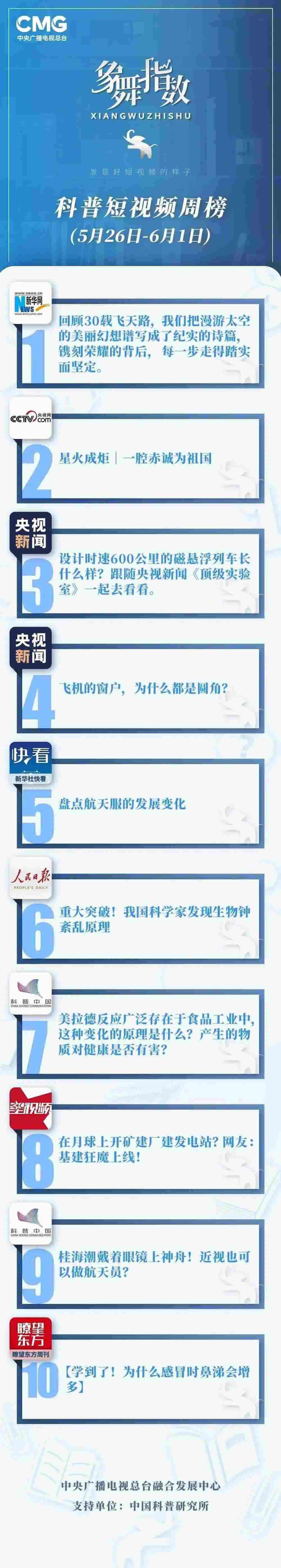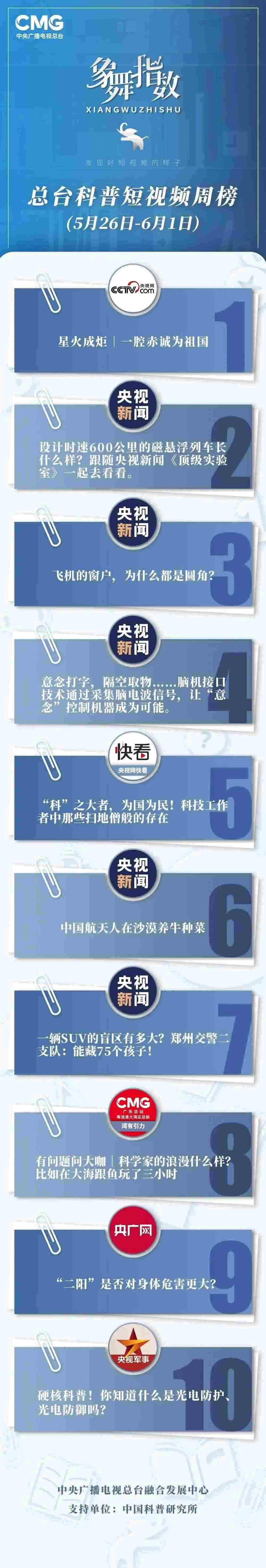 中央廣播電視總臺(tái)“象舞指數(shù)”評(píng)議品牌,推出科普短視頻周榜、總臺(tái)科普短視頻周榜。在2023年5月26日-6月1日,值得注目的內(nèi)容有: