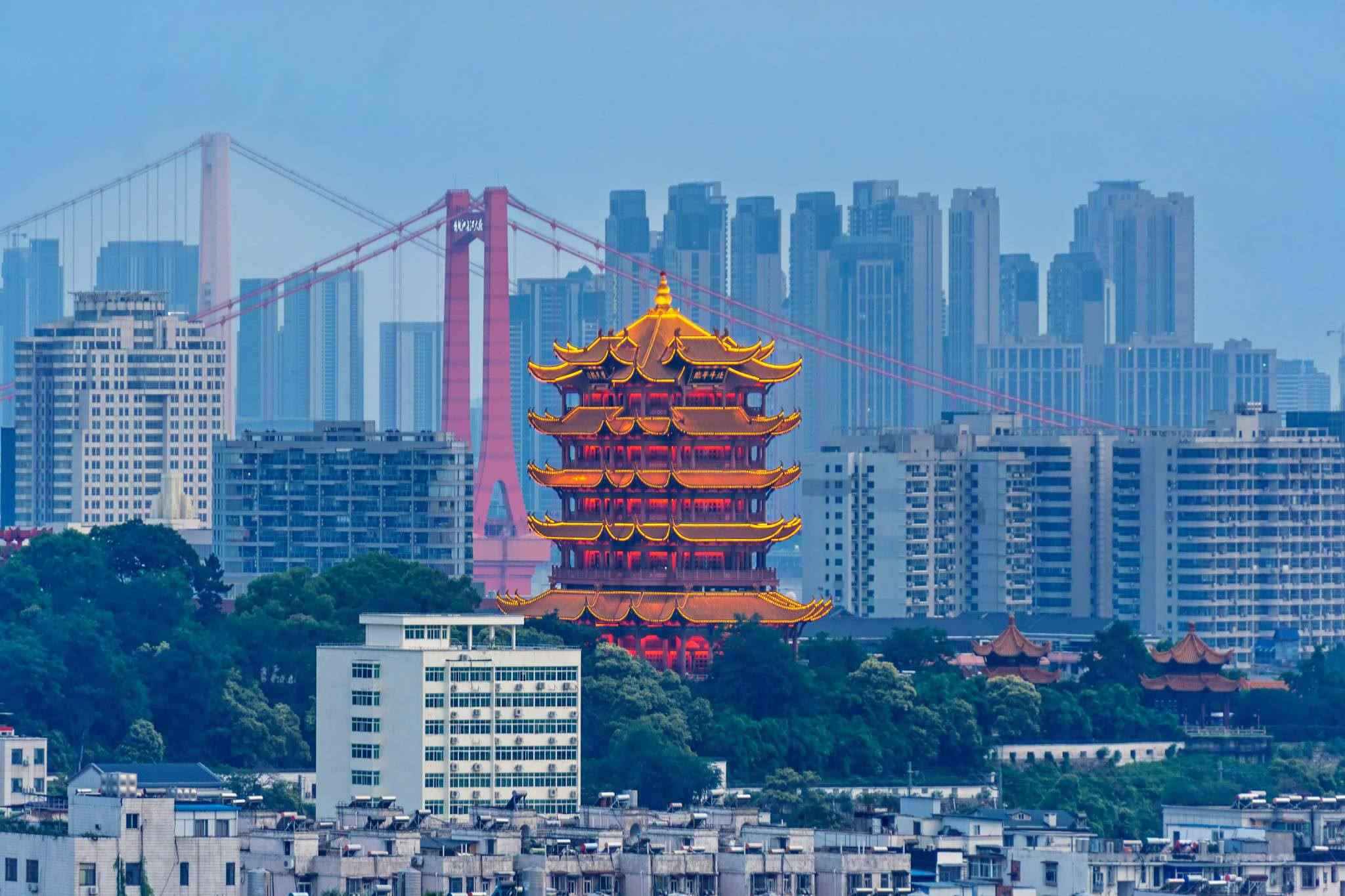 2023年6月8日,武漢,黃鶴樓與鸚鵡洲大橋同框。視覺中國