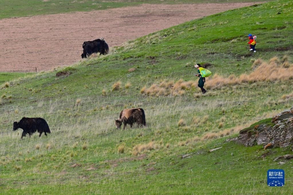 6月9日,在青海省黃南藏族自治州澤庫縣的高原草原上,當(dāng)?shù)啬撩裨诜拍痢?