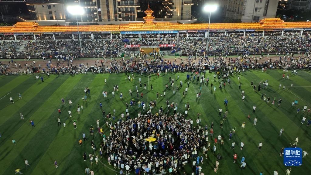 6月10日,演員在貴州“村超”足球比賽后表演民族舞蹈“多耶”,現(xiàn)場觀眾一起上場狂歡(無人機(jī)照片)。