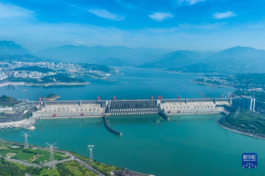 6月10日在湖北省宜昌市秭歸縣拍攝的三峽水庫水位下降后的三峽大壩(無人機照片)。