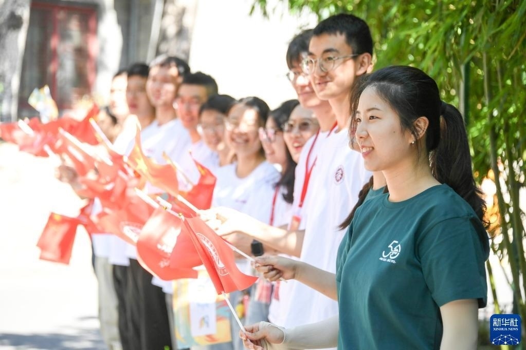 6月10日,大學(xué)生為火炬手加油。新華社記者 任超 攝