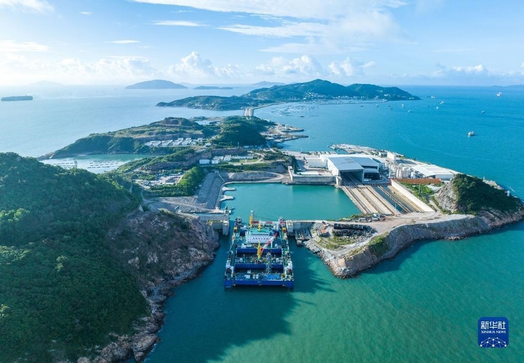“一航津安1”號(hào)沉管運(yùn)輸安裝一體船拖帶E23管節(jié)和最終接頭從珠海桂山島啟航,前往沉放水域(6月8日攝,無(wú)人機(jī)照片)。