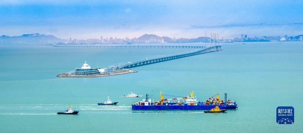“一航津安1”號(hào)沉管運(yùn)輸安裝一體船將E23管節(jié)和最終接頭浮運(yùn)至安裝現(xiàn)場(chǎng)時(shí)經(jīng)過(guò)港珠澳大橋(6月8日攝,無(wú)人機(jī)照片)。