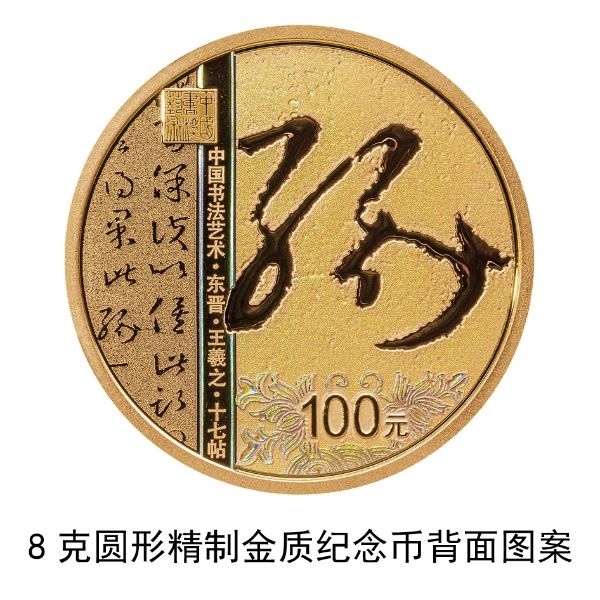 8克圓形金質(zhì)紀念幣背面圖案為東晉王羲之書《十七帖》局部文字及“緣”字樣與裝飾紋樣、“中國書法藝術(shù)”篆刻鈐印等組合設(shè)計,并刊“中國書法藝術(shù)·東晉·王羲之·十七帖”字樣及面額。