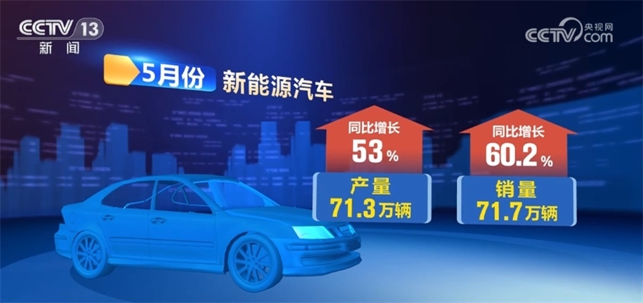 其中,新能源汽車產(chǎn)銷量分別完成71.3萬輛和71.7萬輛,同比分別增長53%和60.2%,市場占有率達到30.1%。在出口方面,5月份,全國汽車出口38.9萬輛,同比增長58.7%。