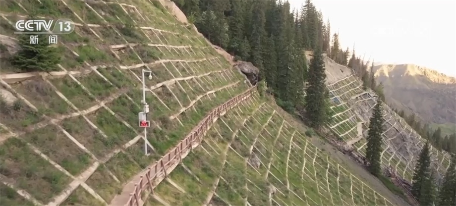 天池的水來自于天山深處的冰川融水,由南向北形成多條瀑布、河流,一路向山下奔流,成為當?shù)刂匾霓r(nóng)業(yè)灌溉水源,滋養(yǎng)著下游80多萬畝土地。我們現(xiàn)在看到這些鋪在山野中的網(wǎng)格,就是當?shù)卣谶M行的生態(tài)修復與地質(zhì)災害防治工程,人們在這些網(wǎng)格間播撒草籽,來穩(wěn)定區(qū)域生態(tài)環(huán)境,有效防范地質(zhì)災害的發(fā)生。