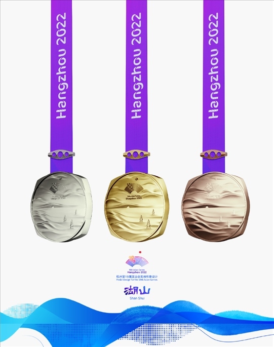 獎牌取名為“湖山”,它的設(shè)計靈感源自五千年良渚文明,展示中國江南文化,呈現(xiàn)杭州山水景觀。在亞運會獎牌設(shè)計中首次將方形玉琮和圓形獎?wù)氯跒橐惑w,其中獎牌正面用凸出的線條勾勒出“三面云山一面城”的杭城畫卷,湖水漣漪,山巒起伏;獎牌背面,形似方形印章,寓意運動員們在杭州亞運會上留下美好的印記。