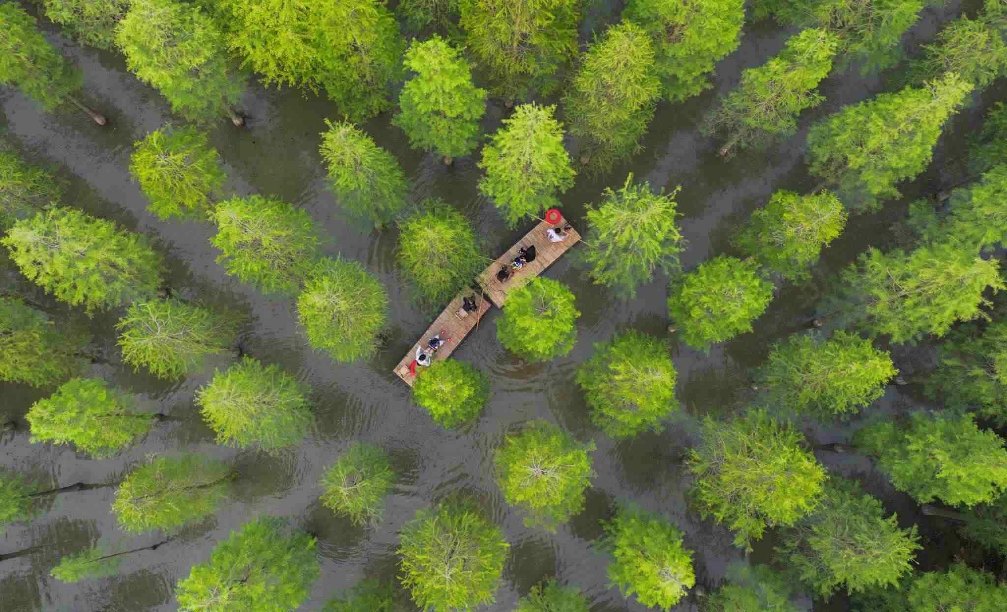 2023年6月16日,江蘇省宿遷市,泗洪縣洪澤湖濕地水杉林滿目蒼翠、郁郁蔥蔥,游客乘坐竹筏,在水杉林間穿梭游玩。視覺(jué)中國(guó)