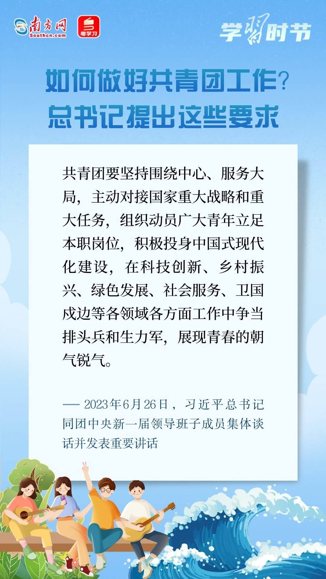 6月26日,習(xí)近平總書(shū)記同團(tuán)中央新一屆領(lǐng)導(dǎo)班子成員集體談話(huà)并發(fā)表重要講話(huà)??倳?shū)記強(qiáng)調(diào),黨和國(guó)家事業(yè)的希望寄托在青年身上。希望共青團(tuán)中央深入貫徹黨中央要求,切實(shí)肩負(fù)起新時(shí)代新征程黨賦予的使命任務(wù),傳承弘揚(yáng)優(yōu)良傳統(tǒng),堅(jiān)持改革創(chuàng)新,更好把青年一代團(tuán)結(jié)凝聚在黨的周?chē)?,為推進(jìn)強(qiáng)國(guó)建設(shè)、民族復(fù)興偉業(yè)接續(xù)奮斗。