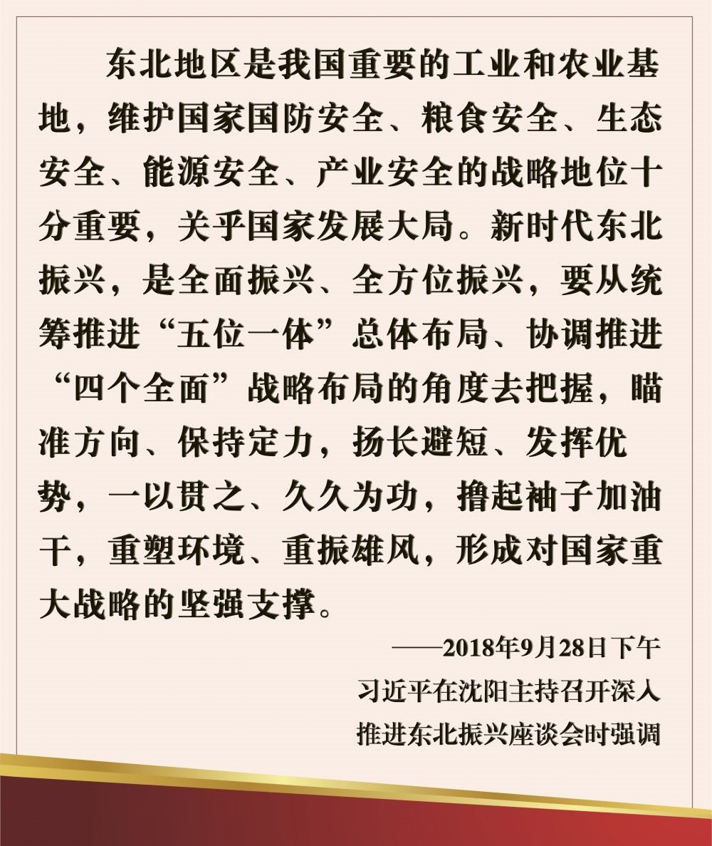 他強調(diào),新時代新征程推動?xùn)|北全面振興,要貫徹落實黨的二十大關(guān)于推動?xùn)|北全面振興實現(xiàn)新突破的部署,完整準確全面貫徹新發(fā)展理念,牢牢把握東北在維護國家“五大安全”中的重要使命,牢牢把握高質(zhì)量發(fā)展這個首要任務(wù)和構(gòu)建新發(fā)展格局這個戰(zhàn)略任務(wù),統(tǒng)籌發(fā)展和安全,堅持目標導(dǎo)向和問題導(dǎo)向相結(jié)合,堅持鍛長板、補短板相結(jié)合,堅持加大支持力度和激發(fā)內(nèi)生動力相結(jié)合,咬定目標不放松,敢闖敢干加實干,努力走出一條高質(zhì)量發(fā)展、可持續(xù)振興的新路子,奮力譜寫東北全面振興新篇章。