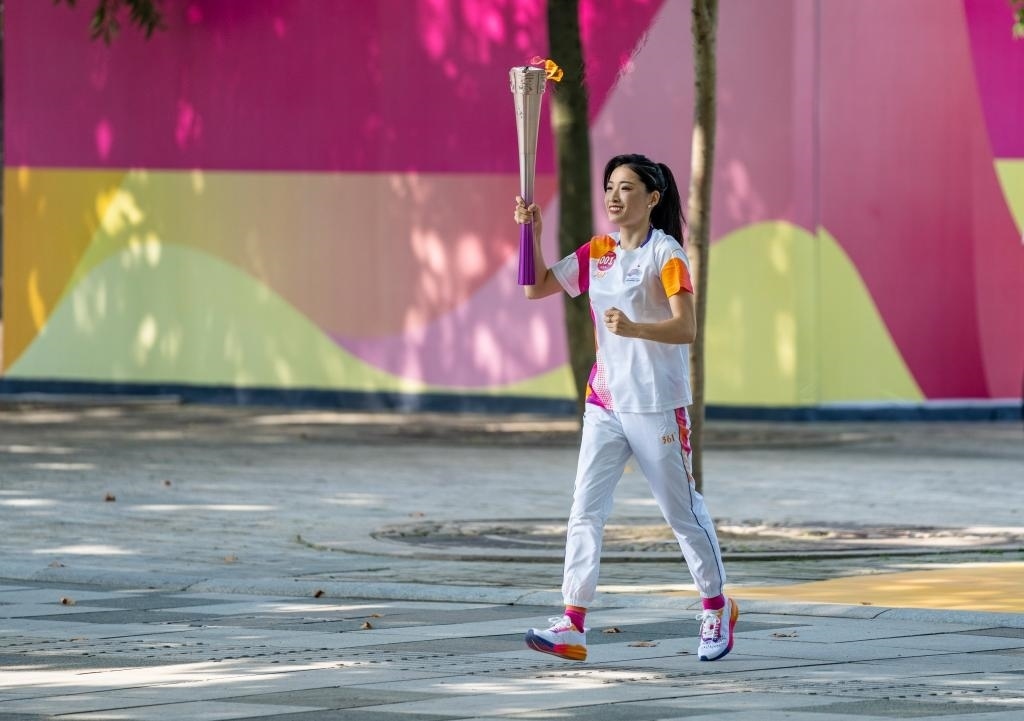 9月8日,火炬手羅雪娟在火炬?zhèn)鬟f中。當(dāng)日,杭州亞運(yùn)會火炬?zhèn)鬟f在杭州西湖涌金公園廣場啟動,共有106棒火炬手參與當(dāng)日傳遞。新華社記者孫非 攝