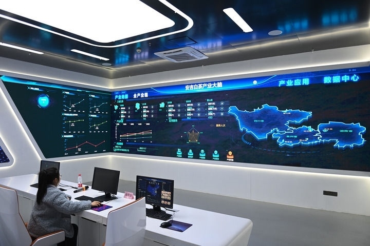 浙江安吉白茶“產業(yè)大腦”顯示黃杜村捐贈種植在貴州、湖南、四川等3省5縣茶苗的分布情況(2023年2月21日攝)。新華社記者 黃宗治 攝