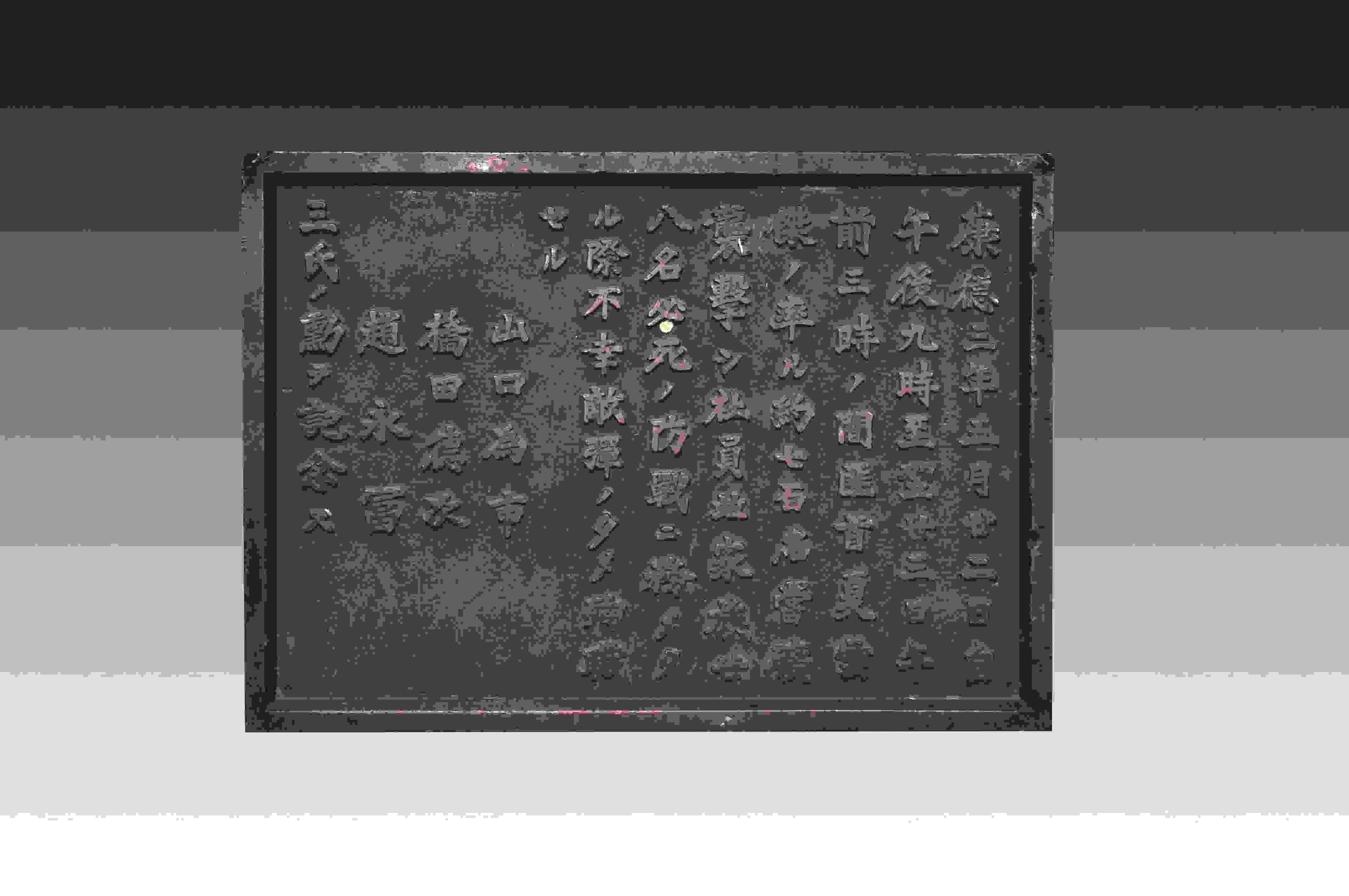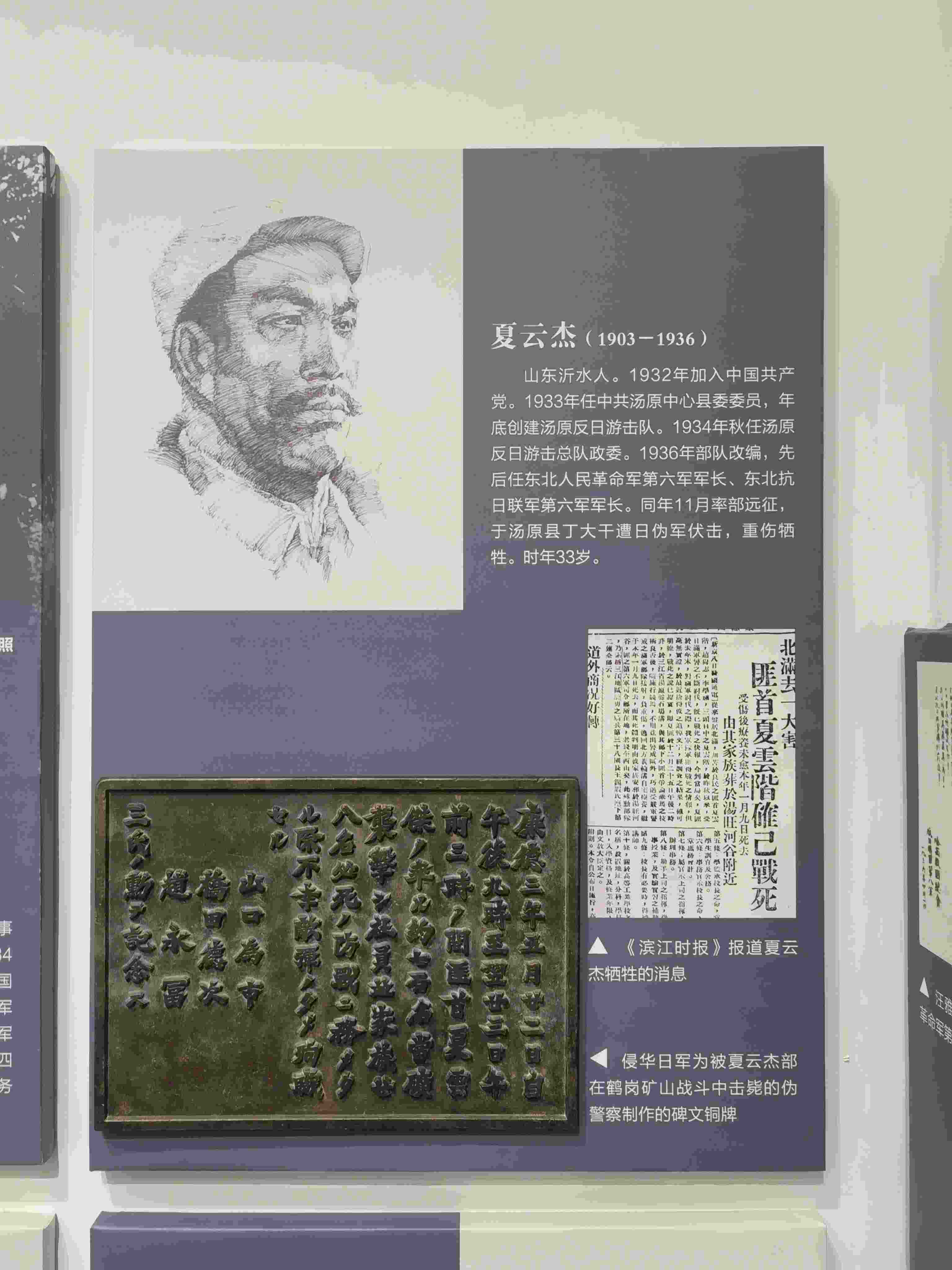這塊碑文銅牌來自黑龍江鶴崗礦區(qū)的一座“忠靈塔”上,是日本侵略者為侵華戰(zhàn)爭中戰(zhàn)死的日偽軍而建。碑文銅牌,長51厘米、高36.5厘米、寬2厘米、重12千克。上面的文字記載了日偽軍和抗聯(lián)戰(zhàn)士戰(zhàn)斗過程。從表述內(nèi)容來看,這塊碑文具有極大欺騙性。它制造了普通百姓遭土匪襲擊的“無辜”假象,妄圖以此加深東北民眾與革命隊伍之間的對立情緒。而事實真相是,1936年5月22日夜,東北人民革命軍第六軍軍長夏云杰指揮六軍第一、二、三團,分兵兩路襲擊了鶴崗礦山。在我黨地下工作人員的密切配合下,順利解除了礦山警察二隊的全部武裝,并擊斃日軍指導官山口為市、橋田德次和偽礦山警察大隊隊長趙永富。這次戰(zhàn)斗繳獲敵人大批槍支彈藥,我軍無一人傷亡。23日凌晨,夏云杰率領(lǐng)部隊攜帶戰(zhàn)利品凱旋。