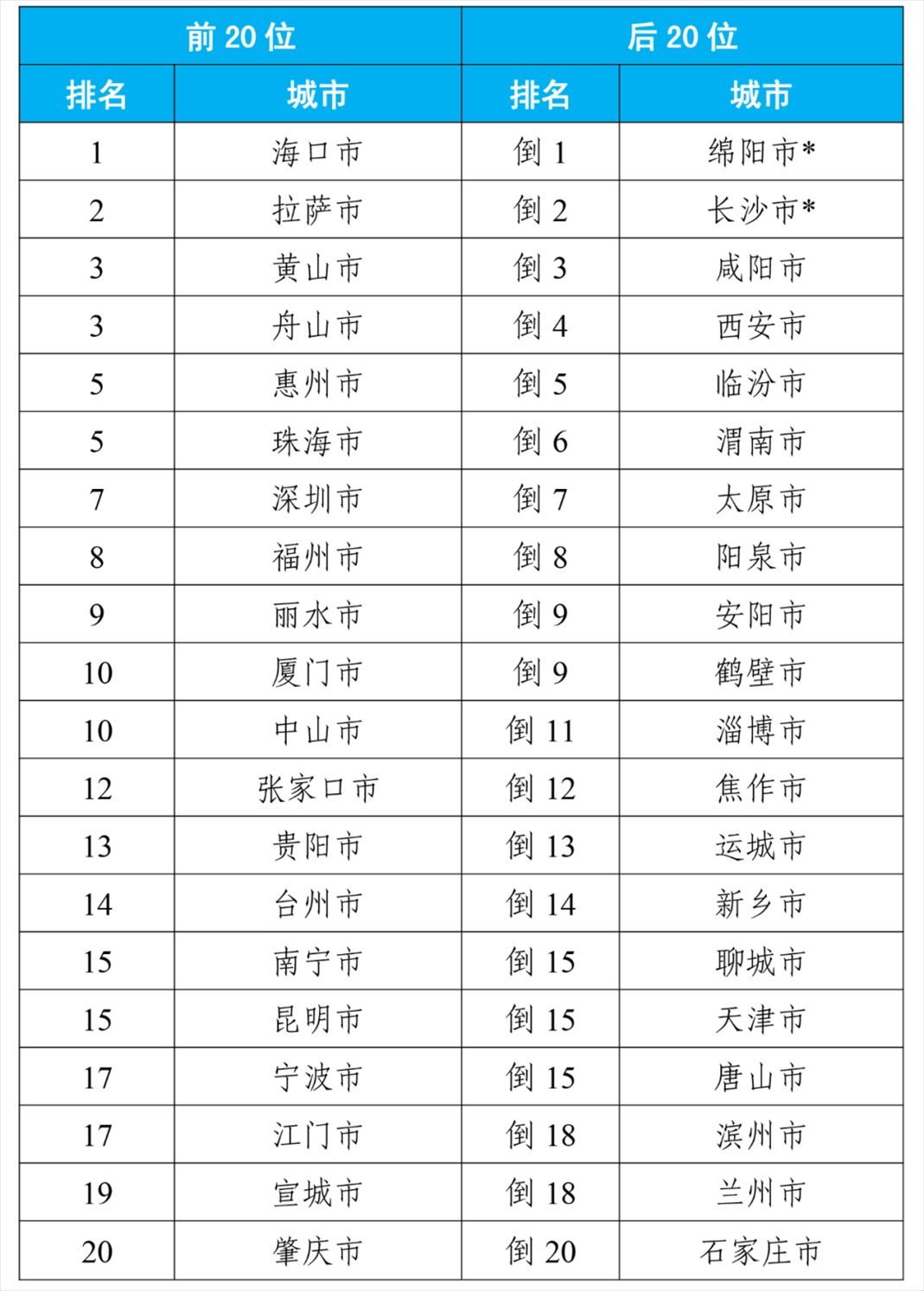 1—8月,168個重點城市中,空氣質(zhì)量排名前20位城市依次是??凇⒗_和黃山等城市(從第1名至第20名);空氣質(zhì)量排名后20位城市依次是綿陽、長沙和咸陽等城市(從倒數(shù)第1名至倒數(shù)第20名)。其中,綿陽市科技城新區(qū)的高新區(qū)自來水公司站點4月和5月、長沙市開福區(qū)的伍家?guī)X站點6月受到嚴重人為干擾,對所在城市當月六項污染物濃度進行了最大值替代處理。見附表2。