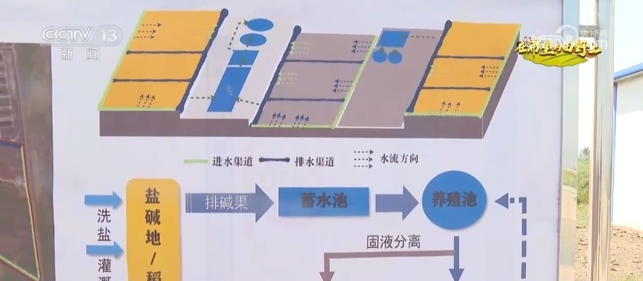 王永利說(shuō),通過(guò)淡水灌溉會(huì)將鹽堿田里的鹽和堿排出地塊,排出的鹽堿水通過(guò)一道道排水溝循環(huán)到蓄水池,最后被輸送到養(yǎng)殖池里養(yǎng)魚(yú),養(yǎng)魚(yú)產(chǎn)生的排泄物經(jīng)過(guò)過(guò)濾后回輸?shù)剿咎?,這樣的漁農(nóng)綜合利用模式讓鹽堿地不斷變好。