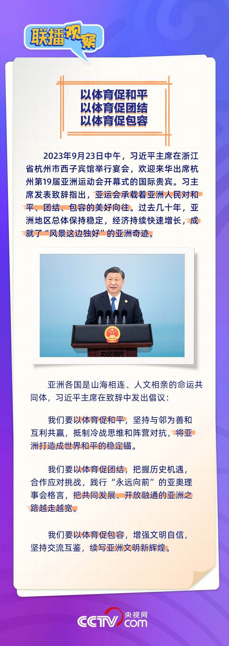 9月23日,習(xí)近平主席在歡迎來華出席杭州第19屆亞洲運動會開幕式的國際貴賓午宴上祝愿大家“在詩畫浙江度過難忘的時光,在亞運會圣火下留下美好的記憶”。